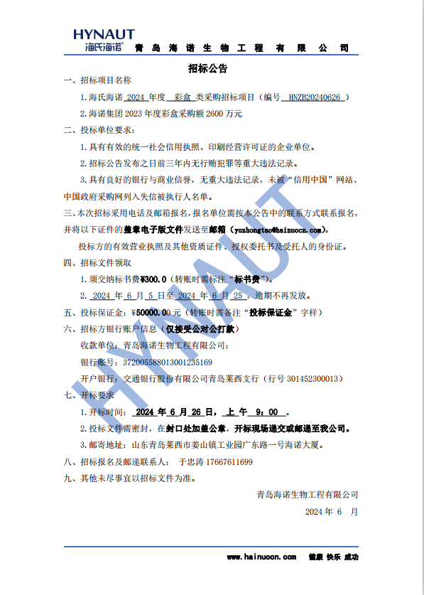 海氏海諾2024年度彩盒類采購(gòu)招標(biāo)項(xiàng)目